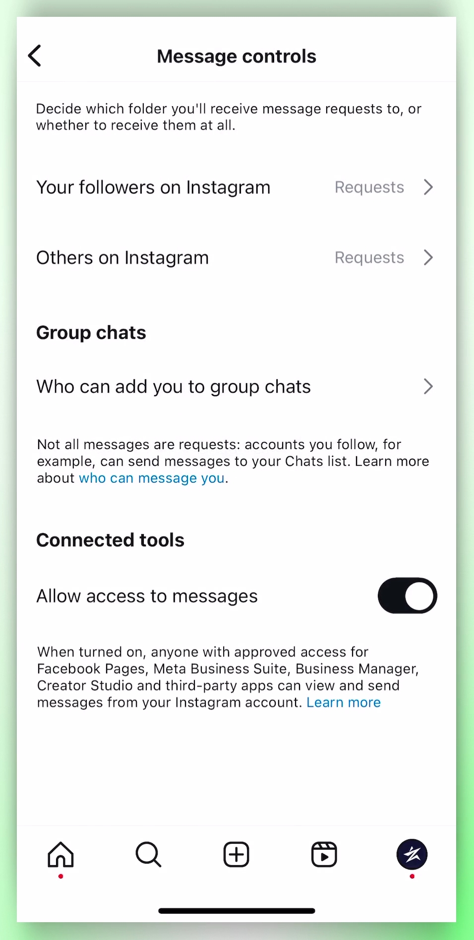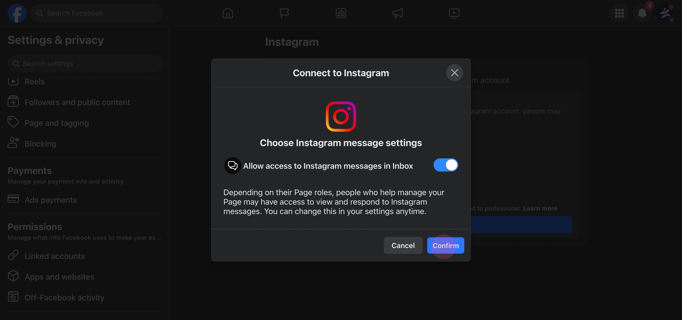 Enable "Allow access to messages" for Instagram DM