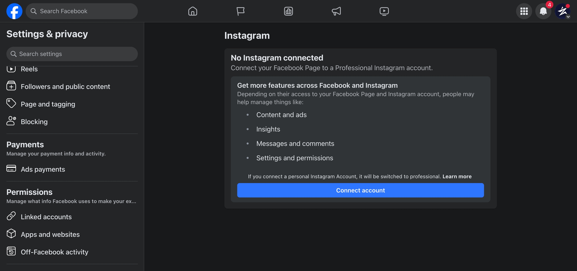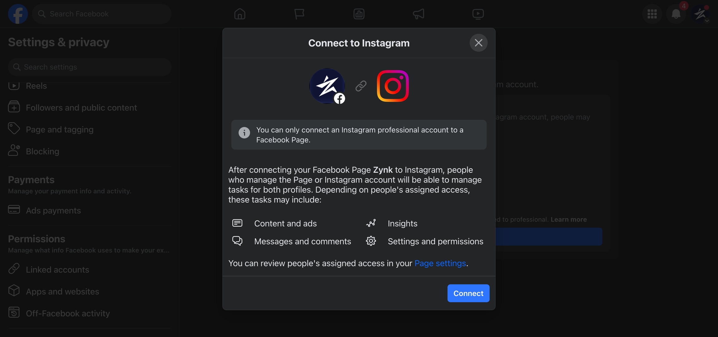 Linking Facebook Page to Instagram