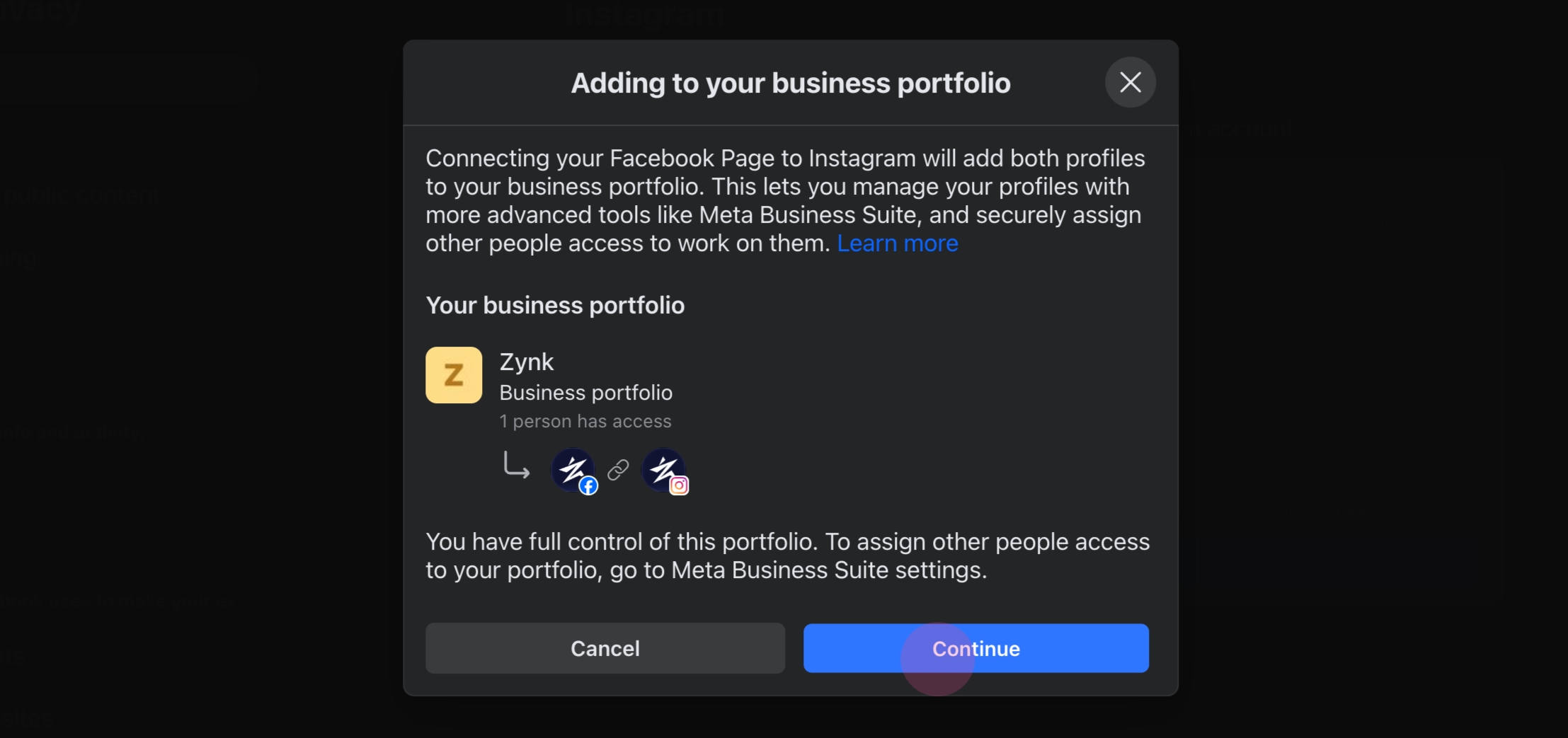 Click on Continue to allow the connection between the Facebook page and the Instagram account.
