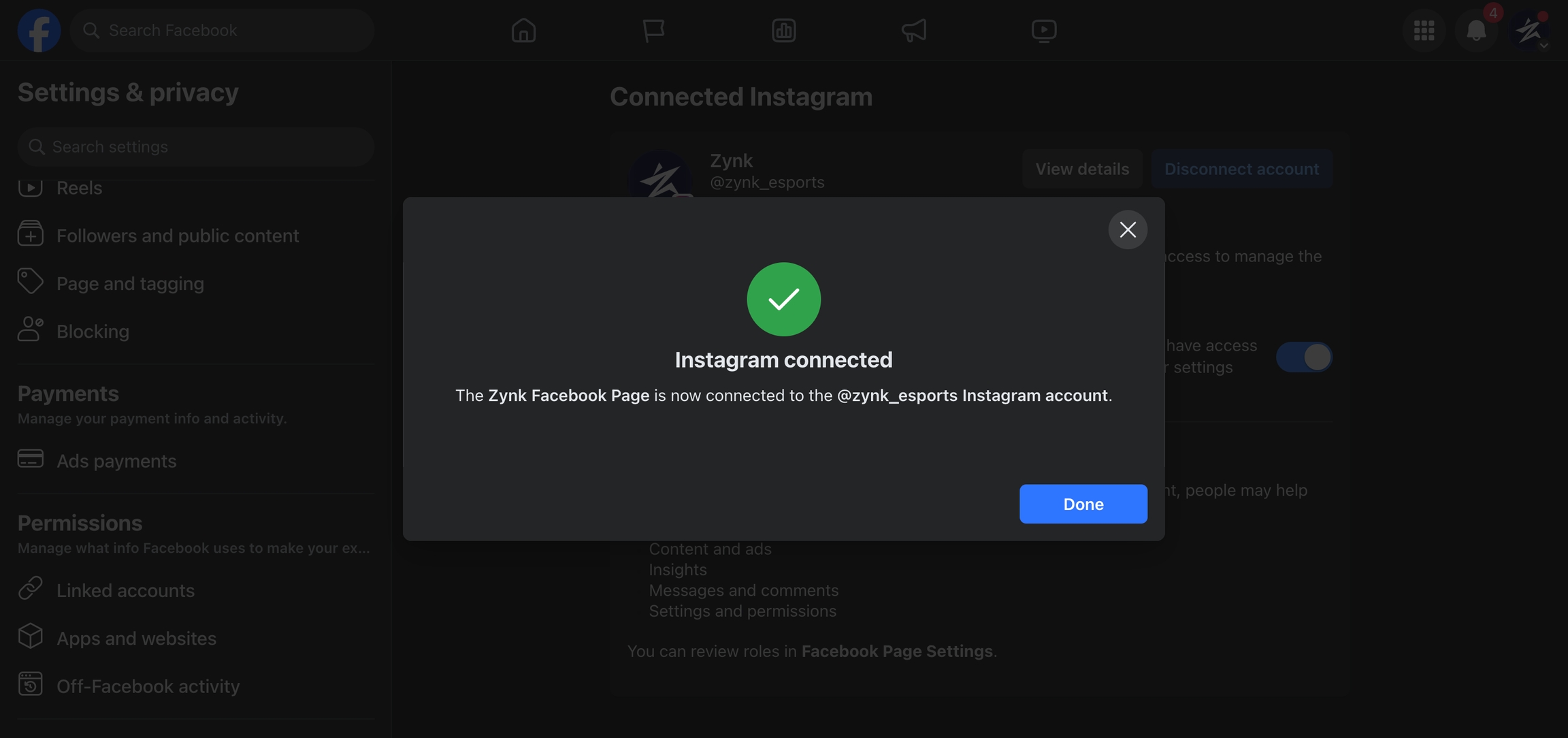 - The Instagram account is now linked to the Facebook page.