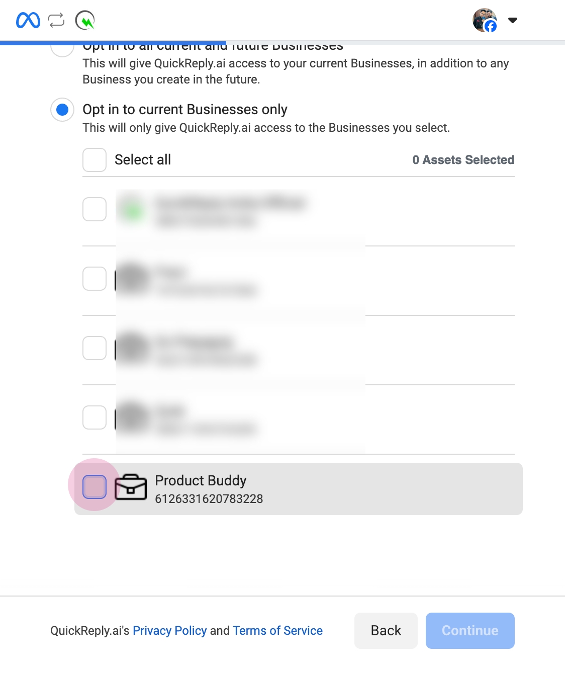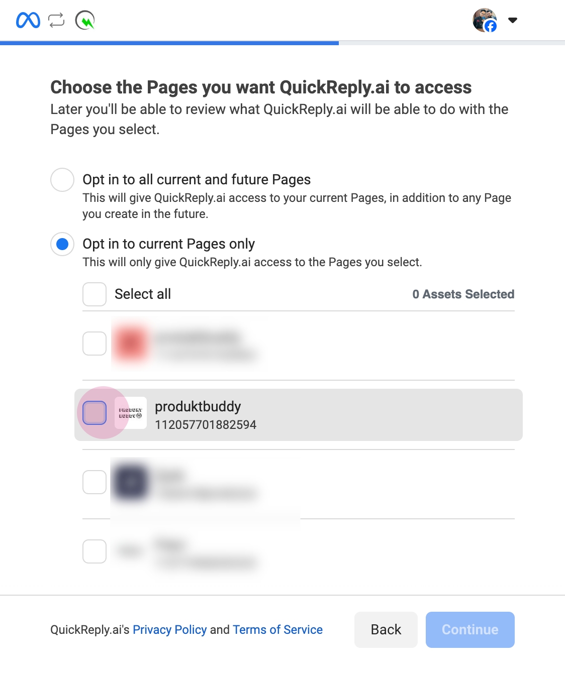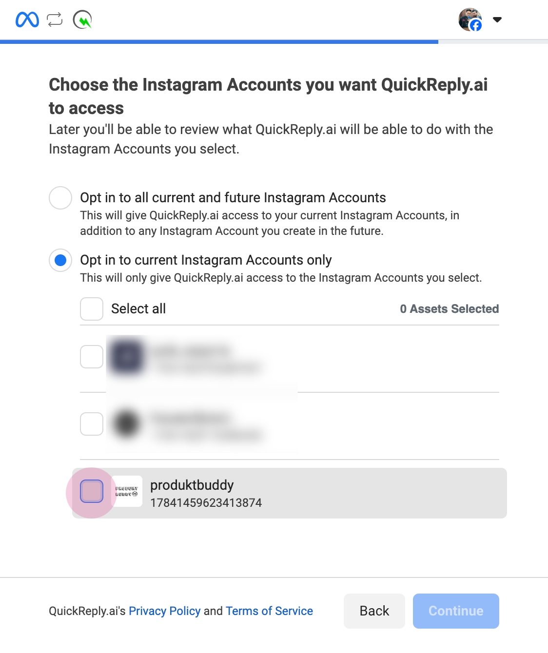 Select the Facebook page you wish to connect. Note, that the linked Instagram page will also be displayed