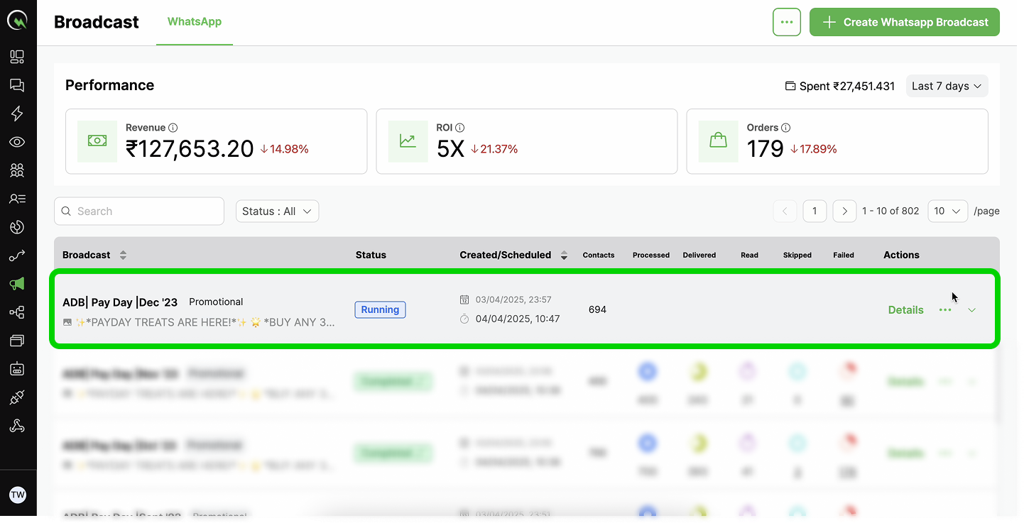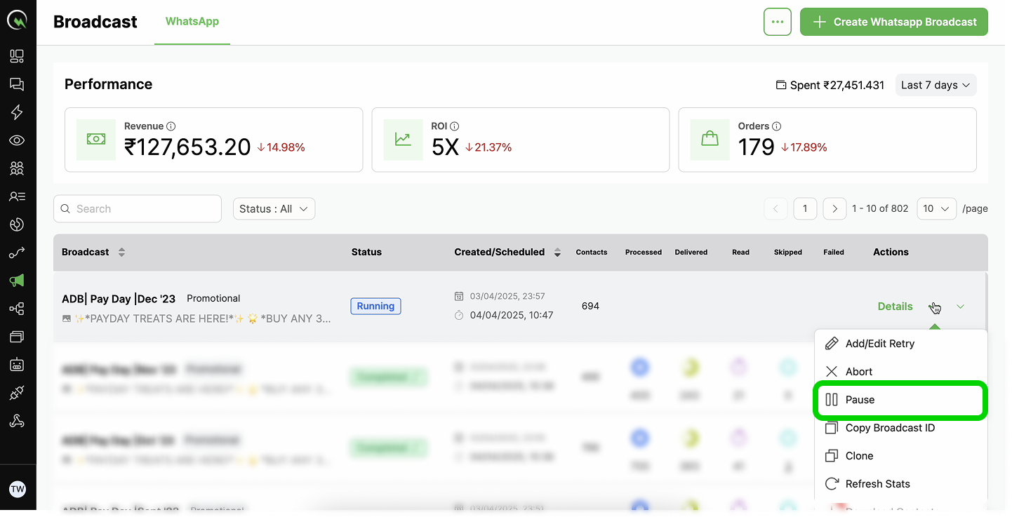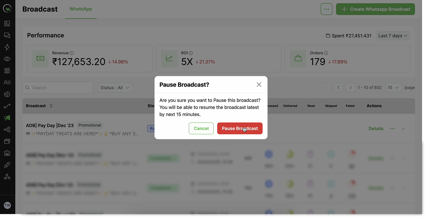 Broadcasts in the 'Running' status can be temporarily paused to prevent further messages from being sent.