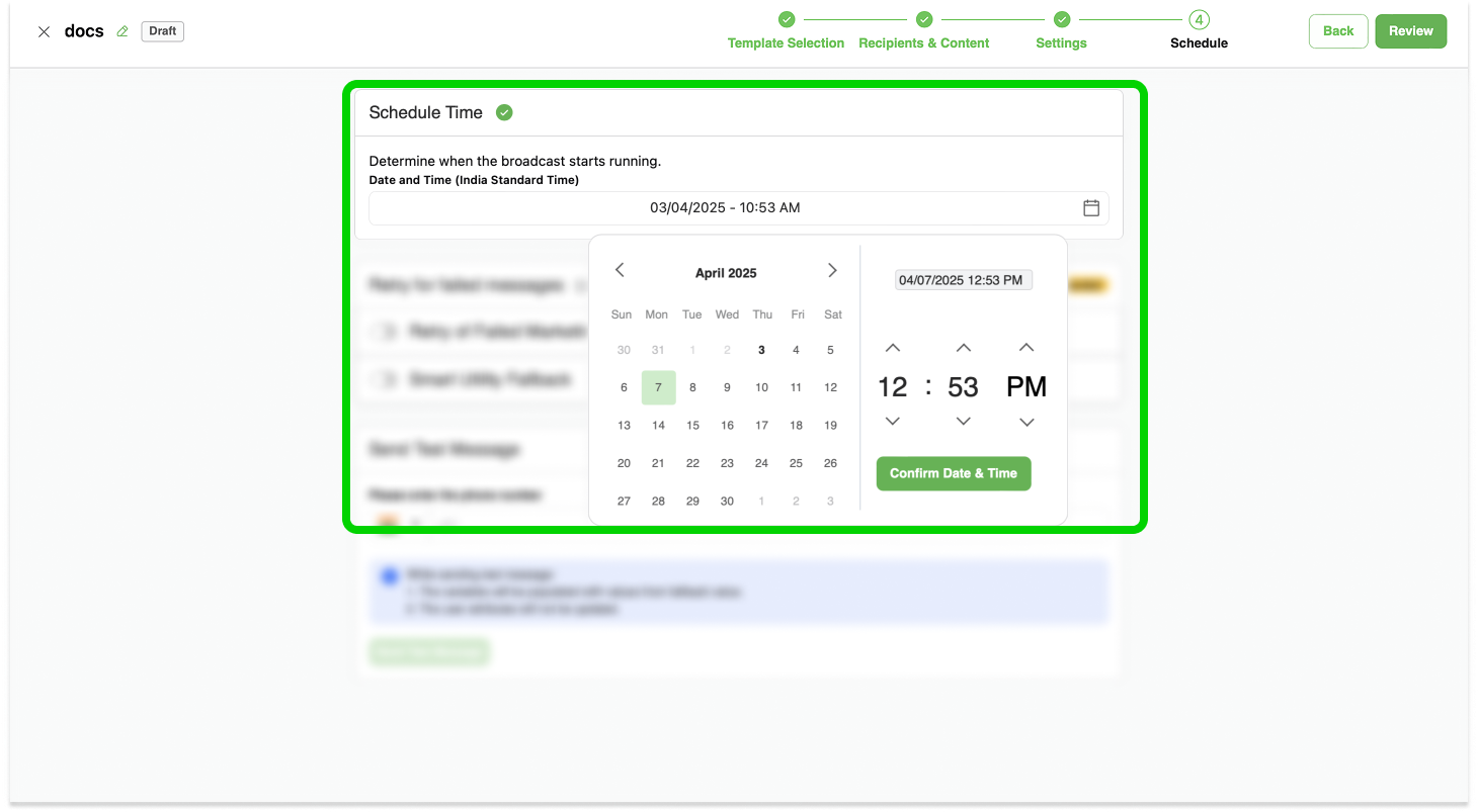 Choose your preferred time and date to reschedule the broadcast from the Schedule tab i.e. Step 4.