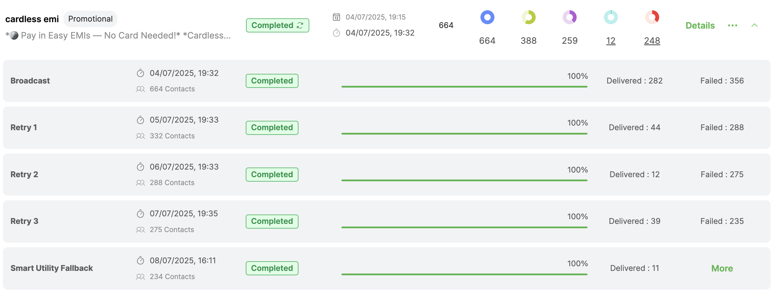 When you're in the Broadcast Dashboard, click on the dropdown available at the right-most side of the listed broadcasts to see the performance of auto-retries and smart utility fallback.