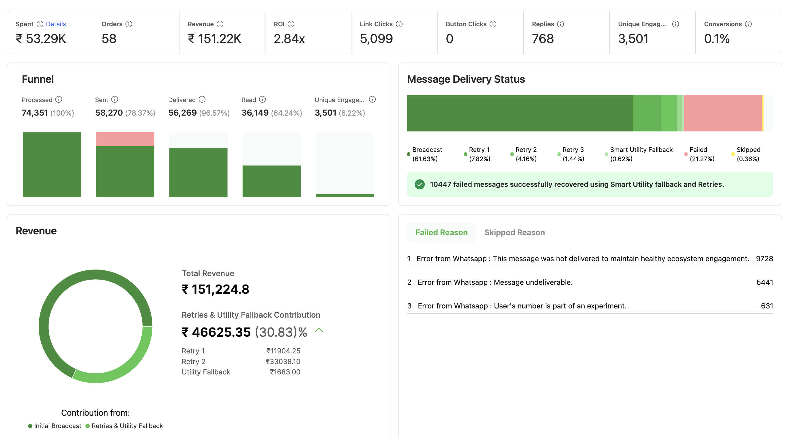 Delivery Metrics: The donut charts represent the different stages of delivery i.e., Processed, Delivered, Read, Skipped, and Failed.