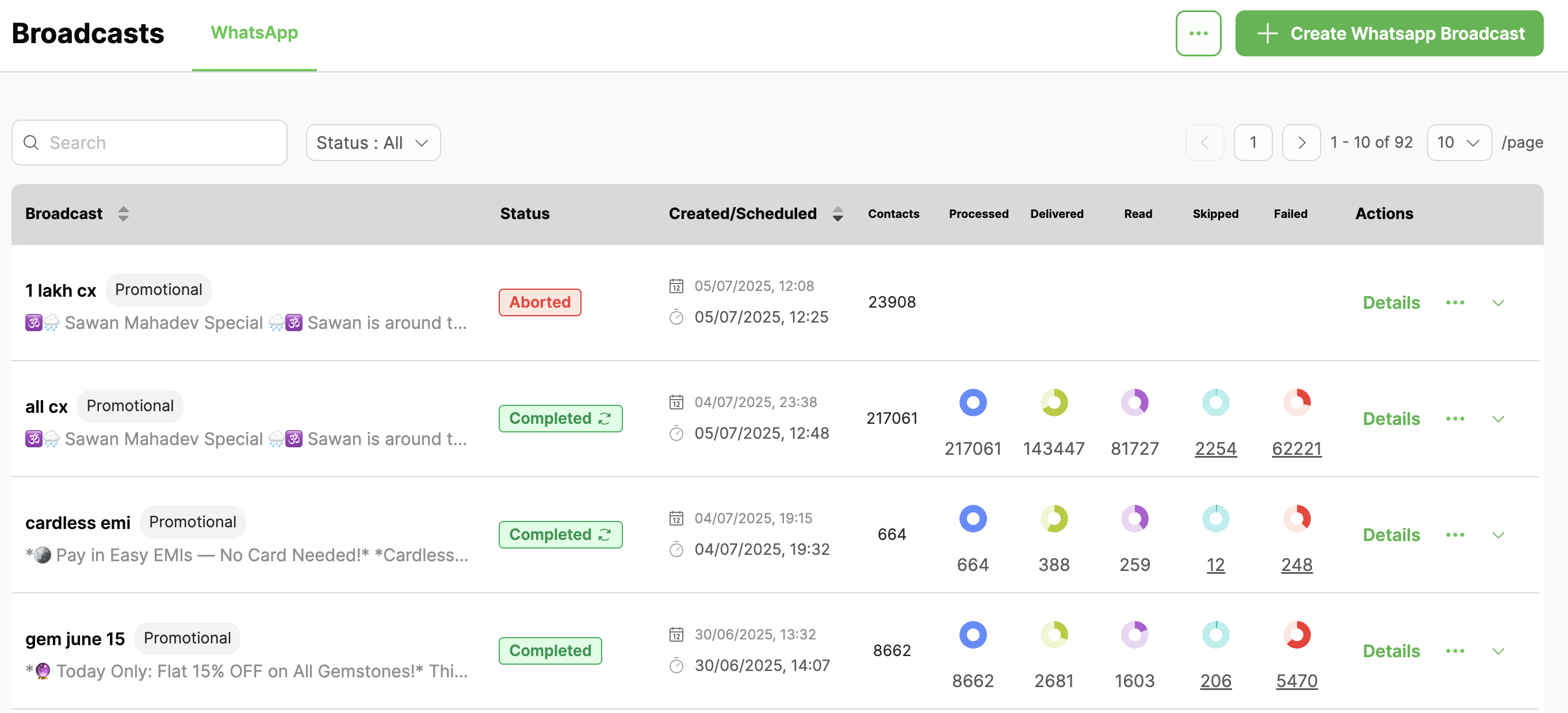 Status Indicator: A color-coded status button that indicates the current status of the broadcast. For example, a green “Completed” status means the broadcast has finished sending, while other colors may indicate draft, scheduled, running, paused, or aborted states.