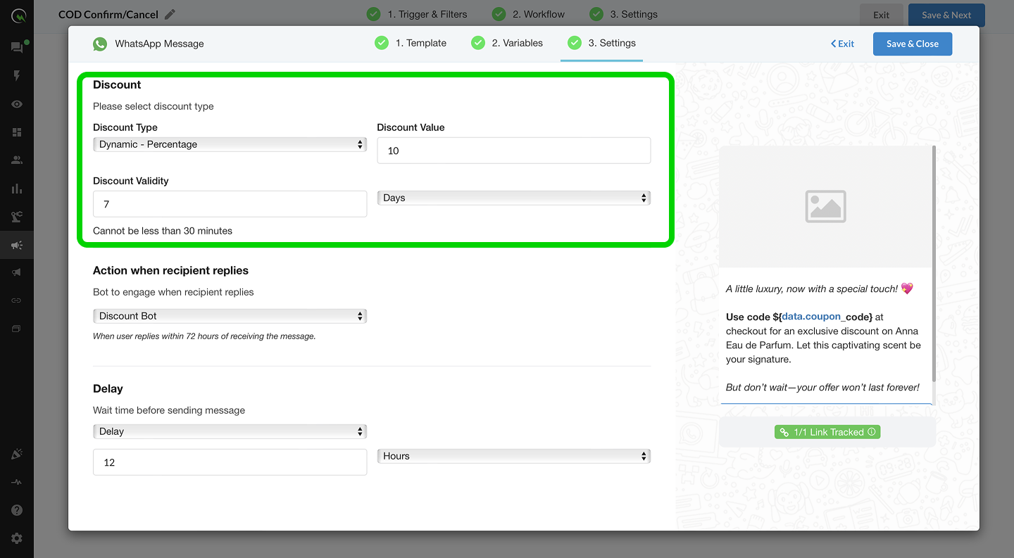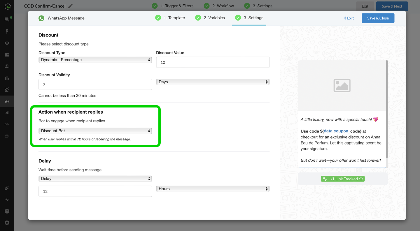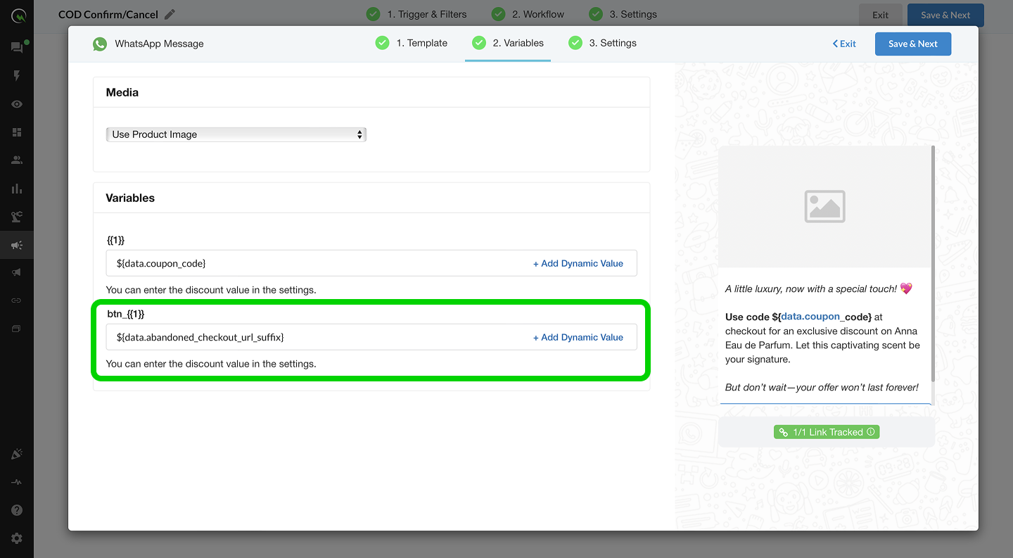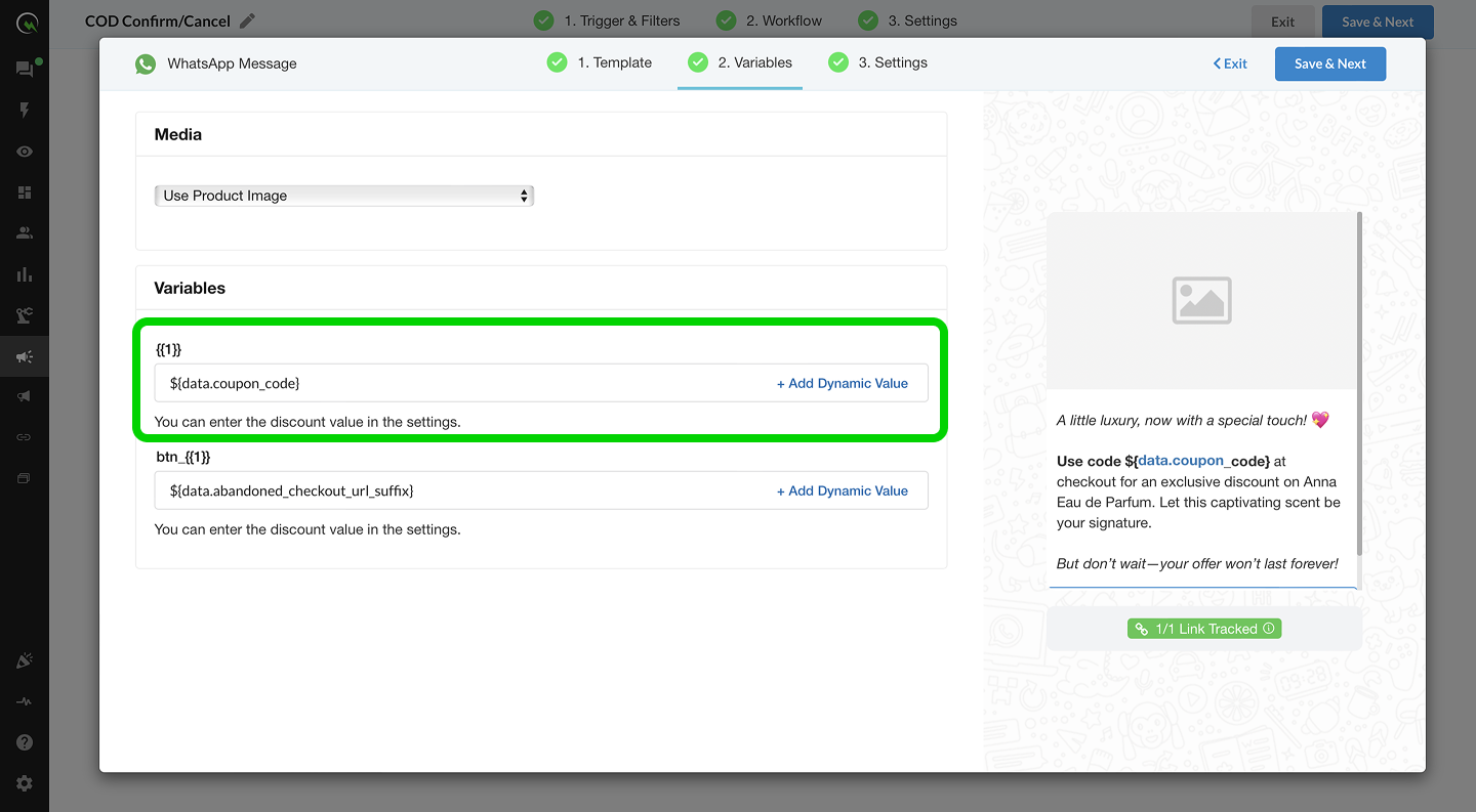 When using templates that contain dynamic fields or buttons, QuickReply allows you to map those variables to specific customer or order data. This ensures messages feel personalized and relevant—without manual editing.