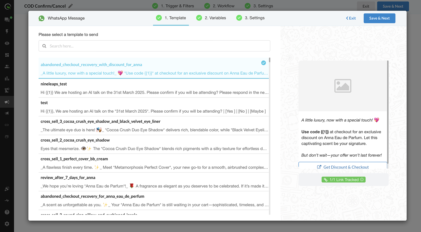Choose the approved WhatsApp template you want to use for each step in the workflow.