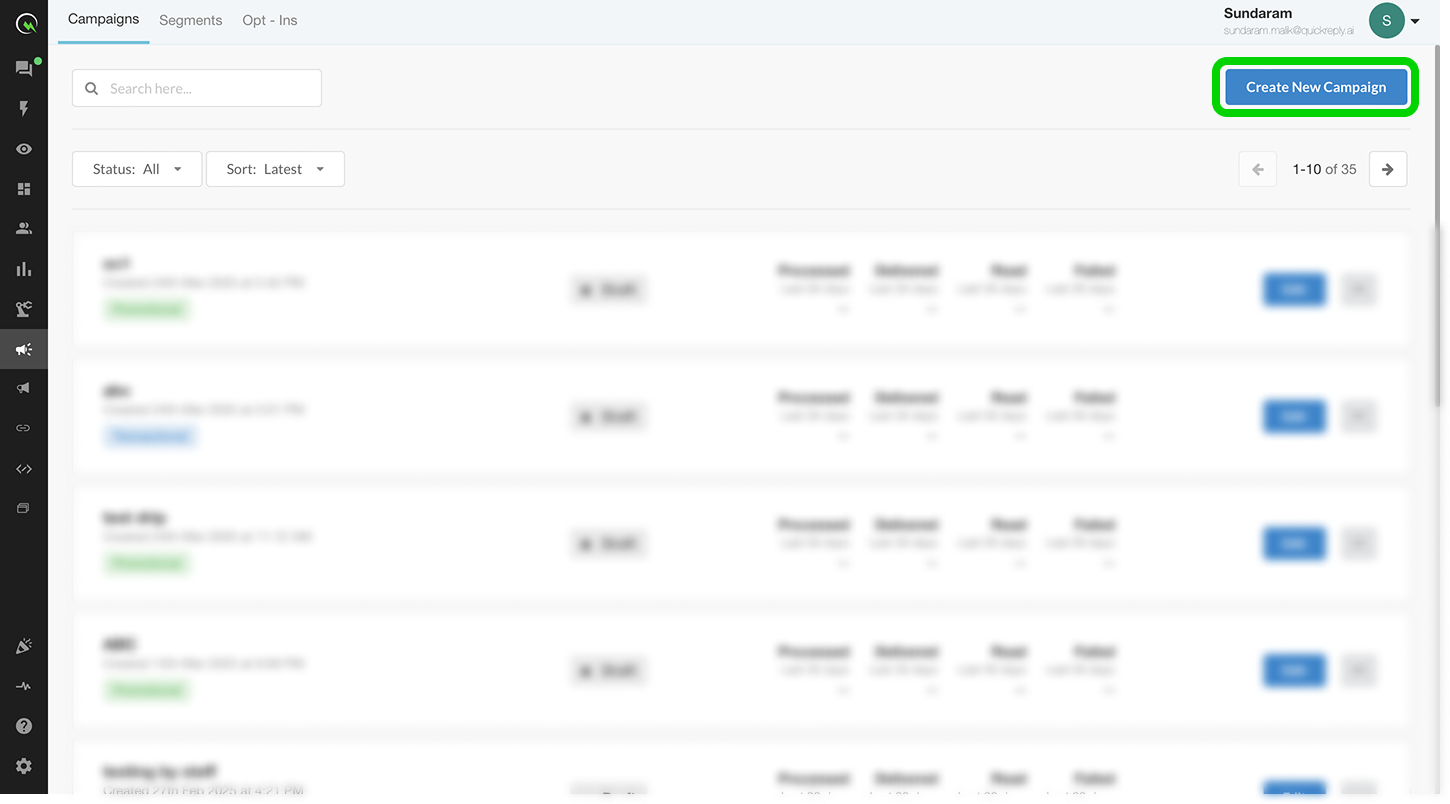 Go to the ‘Campaigns’ tab from the main menu in your QuickReply dashboard. Click ‘Create New Campaign’ to begin setting up your campaign.