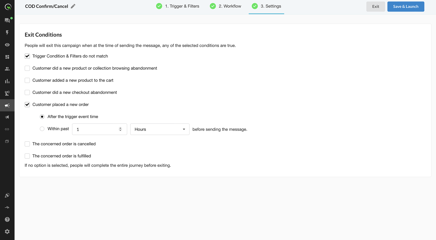 Set up exit rules to determine when a user should stop receiving messages in the sequence. Common exit conditions include:
