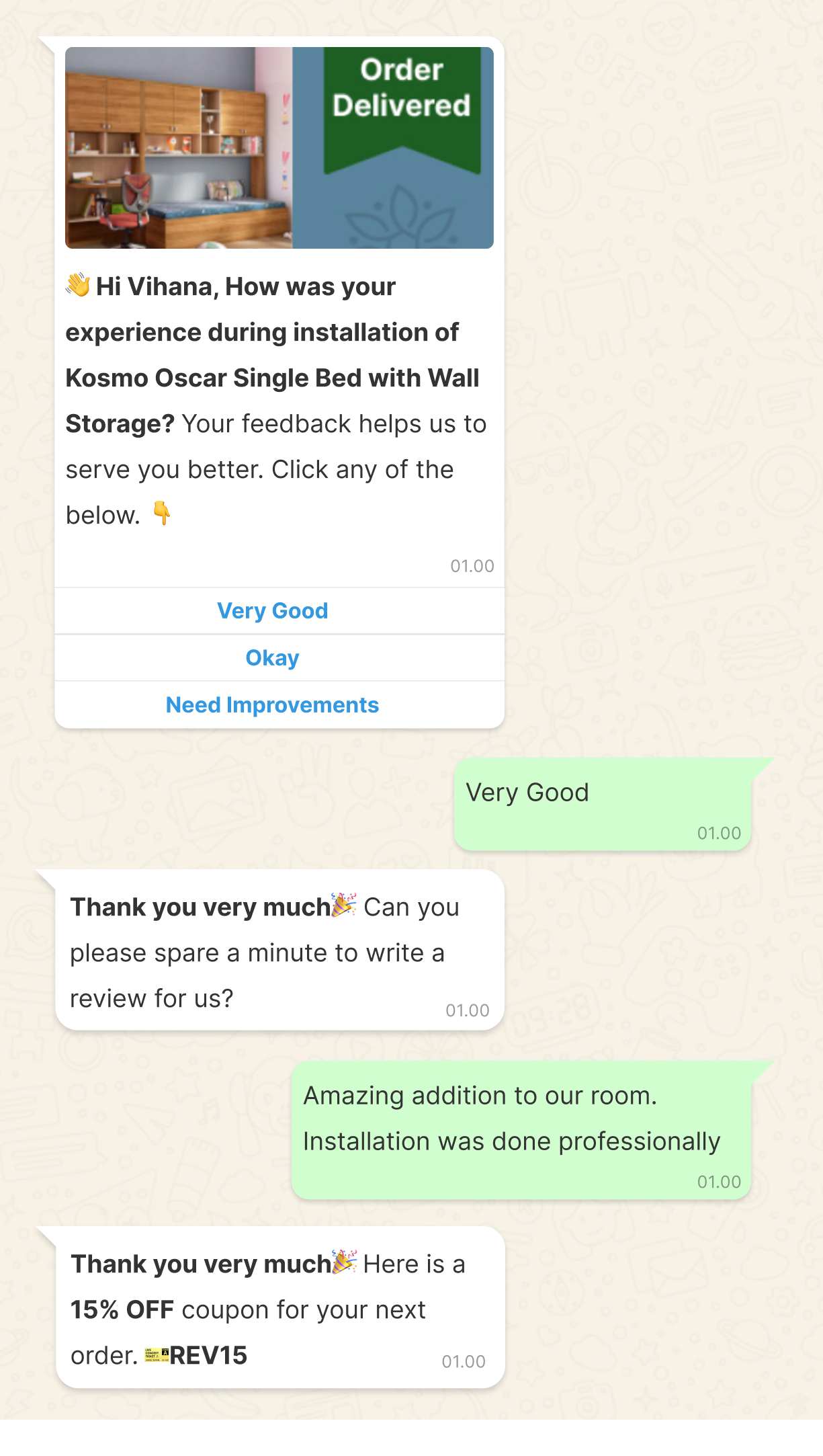 1. **3 days after delivery**: Ask for rating (emoji or star system).
