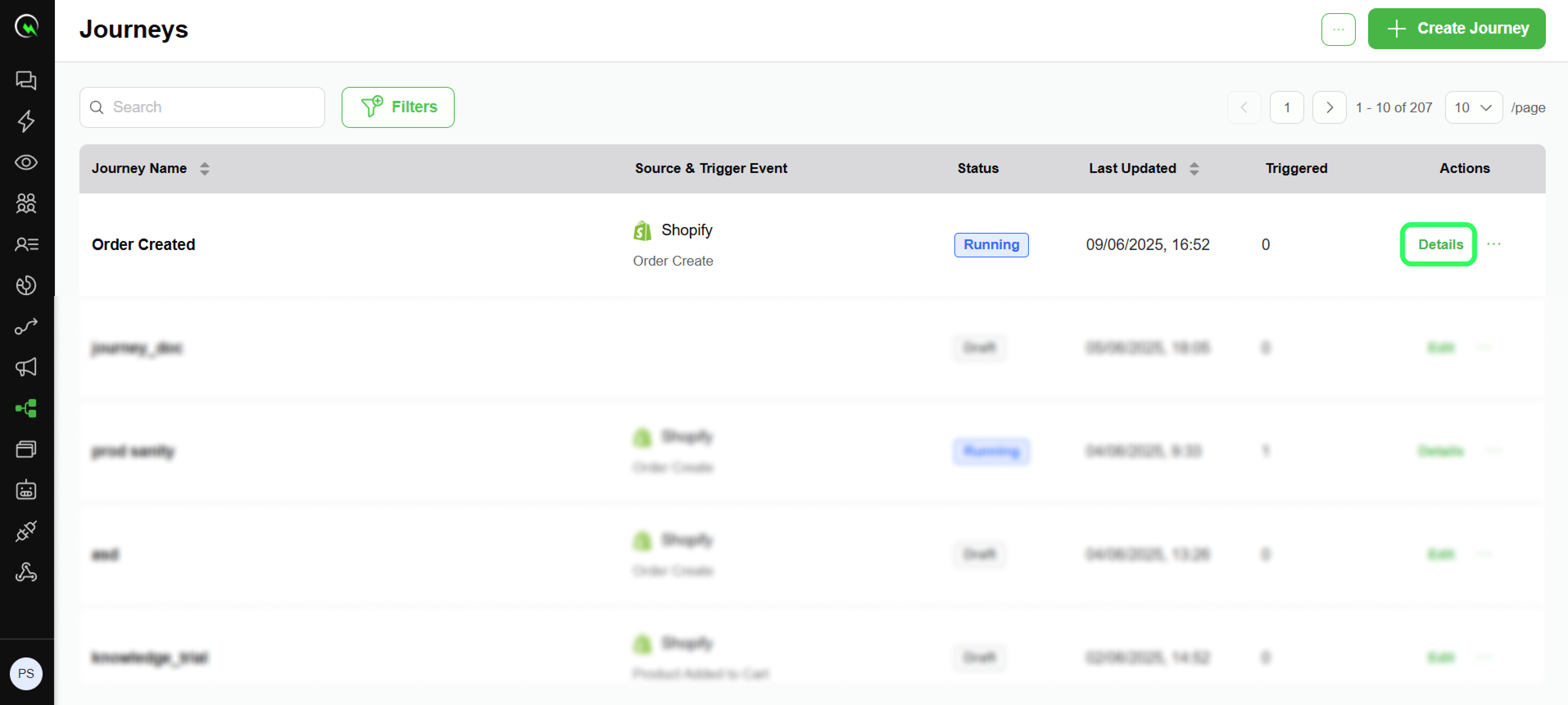 Click on the Details button next to the desired journey. This will open the Journey Details page, where you can view important metrics and data related to the journey’s performance.