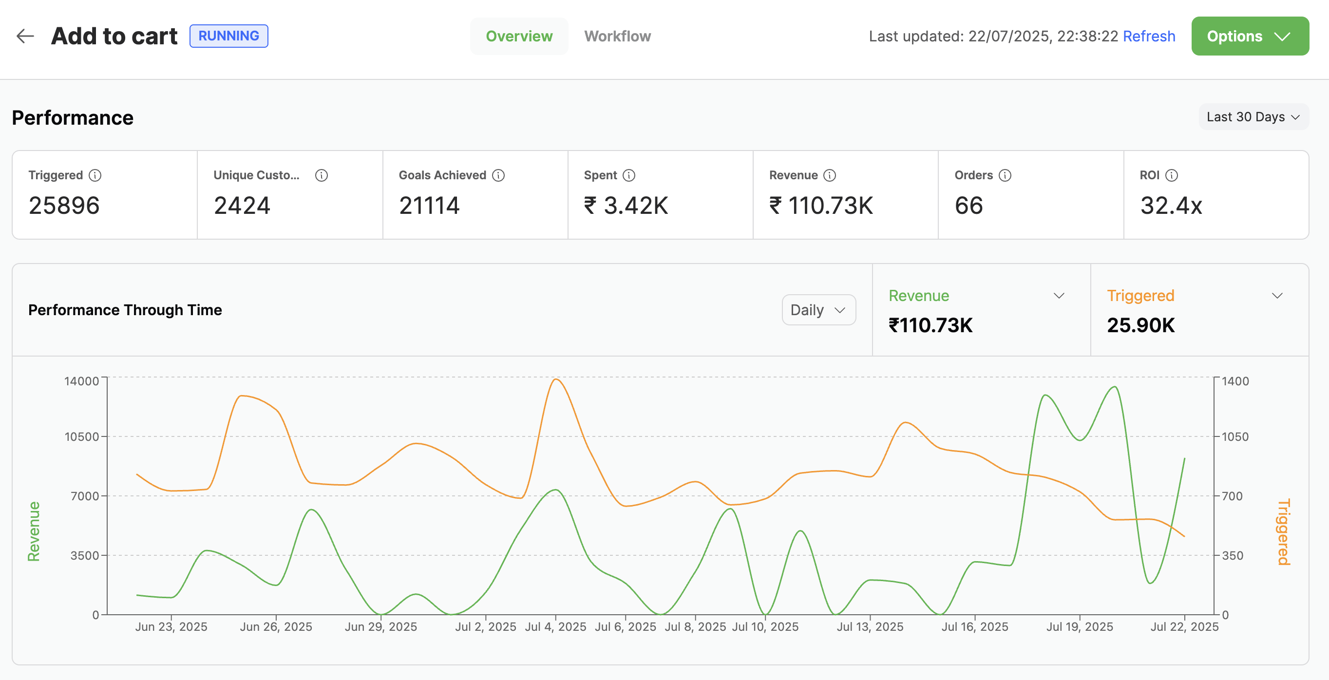 It also includes a performance graph to visualize activity over time, details about the journey’s trigger event, and the status of goal and exit conditions. This helps users track effectiveness and identify areas for optimization.