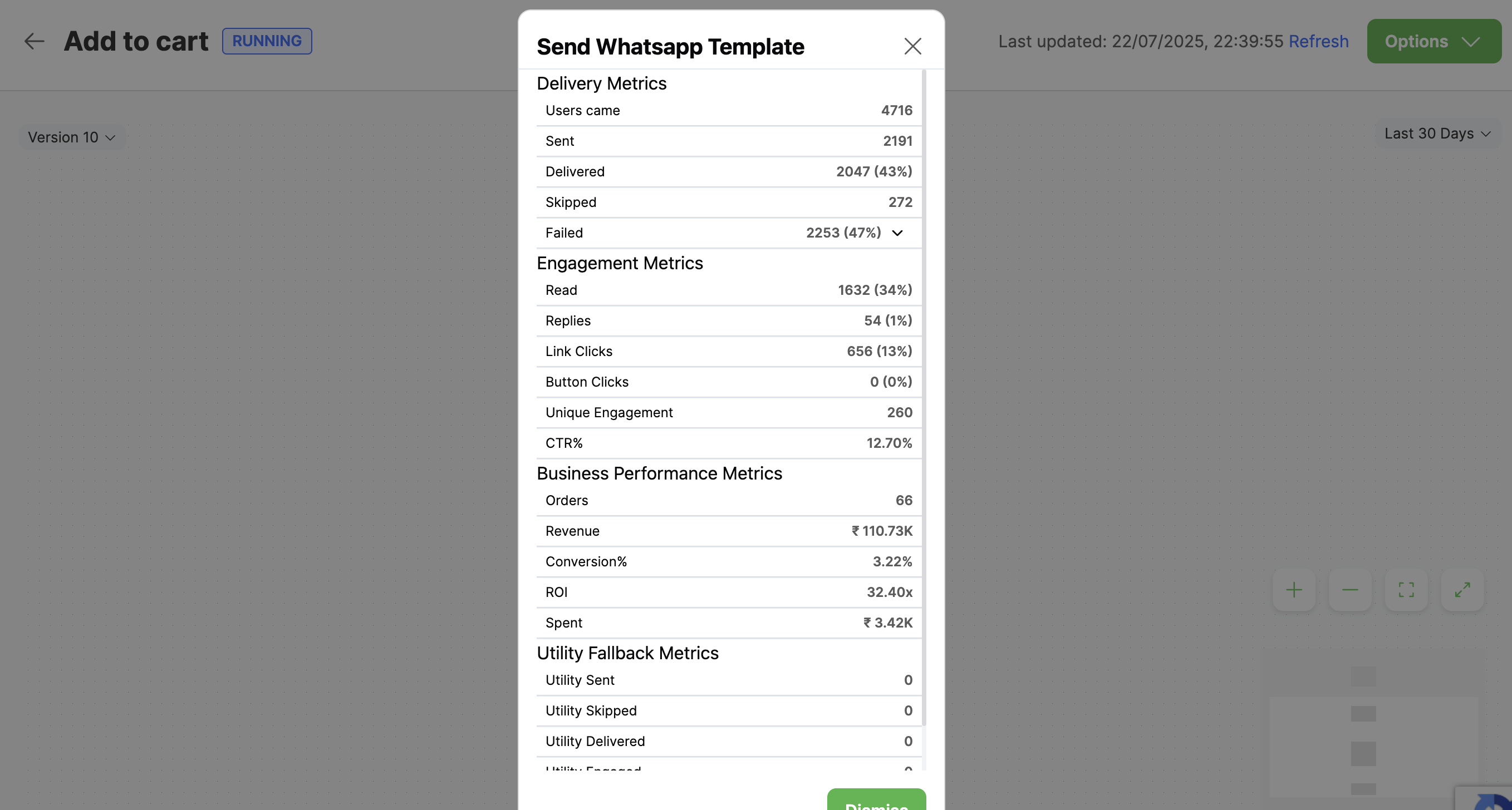 The Journey Analytics Dashboard provides a snapshot of how a journey is performing. Users can view key metrics such as: