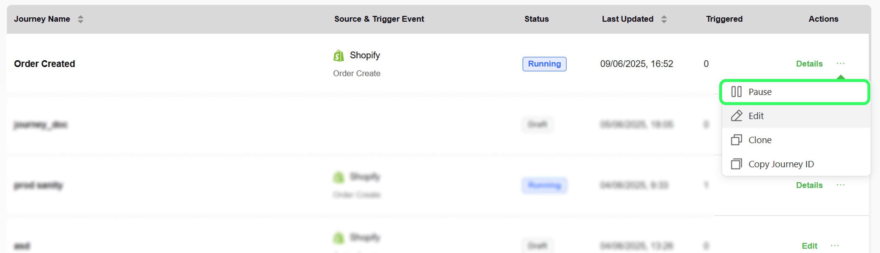 By default, when a journey is published, its status changes to "Running." To prevent the journey from triggering, you can follow these steps to pause it.