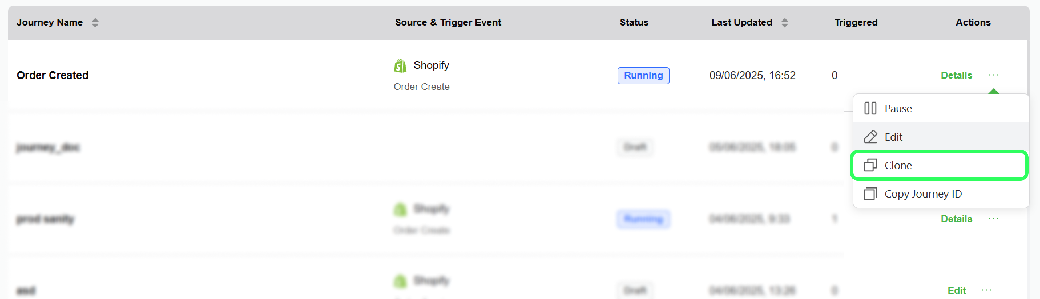 You can easily duplicate a journey using this option. When you clone a journey, its status is set to "Draft" by default. You can clone a journey using the following steps.