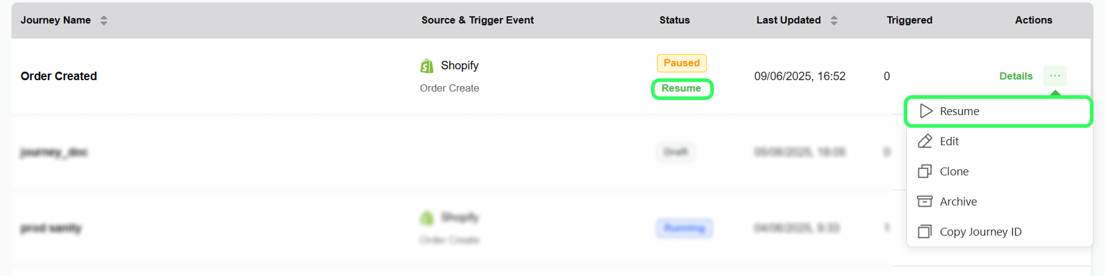 1. Navigate to the journey which is in the Paused status, and you wish to resume