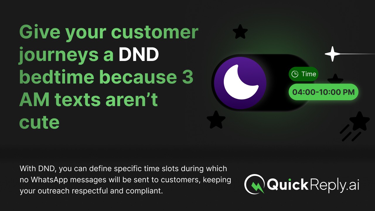 The Do Not Disturb (DND) Hours feature allows you to control when WhatsApp messages from your automated journeys are delivered. By setting DND windows, you can ensure that customers do not receive messages late at night or during sensitive hours- improving customer experience, maintaining compliance, and safeguarding your brand reputation.