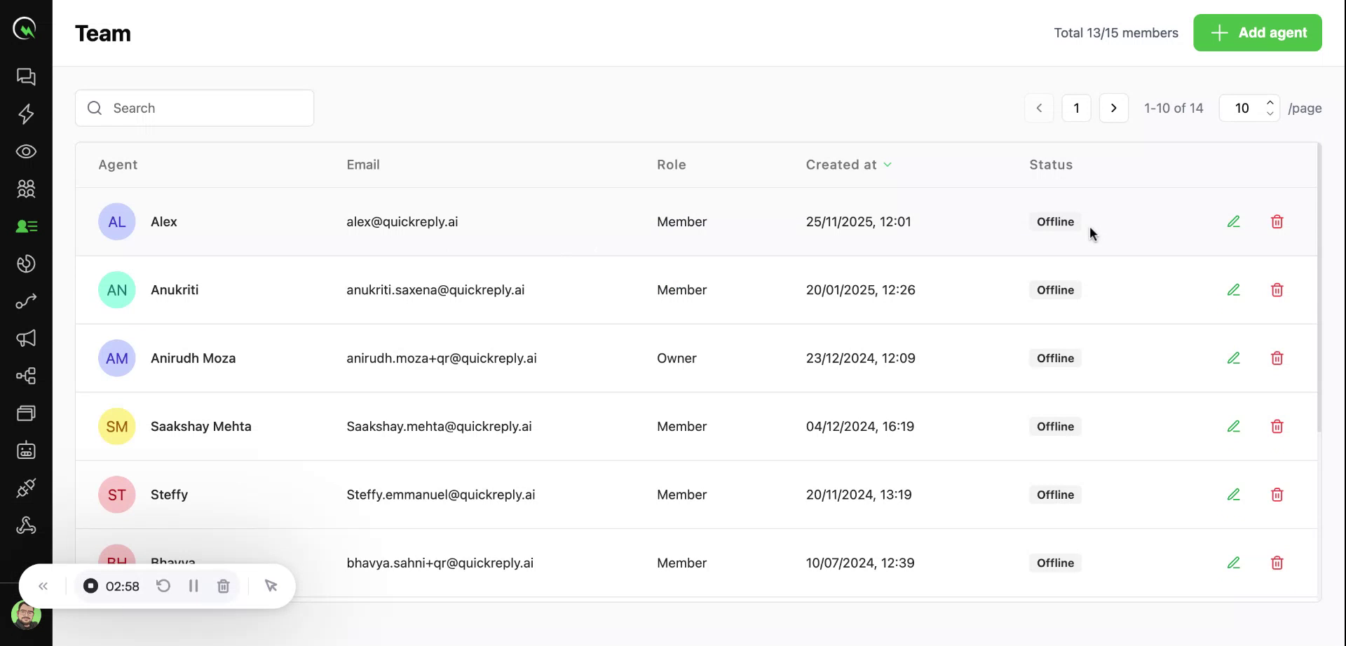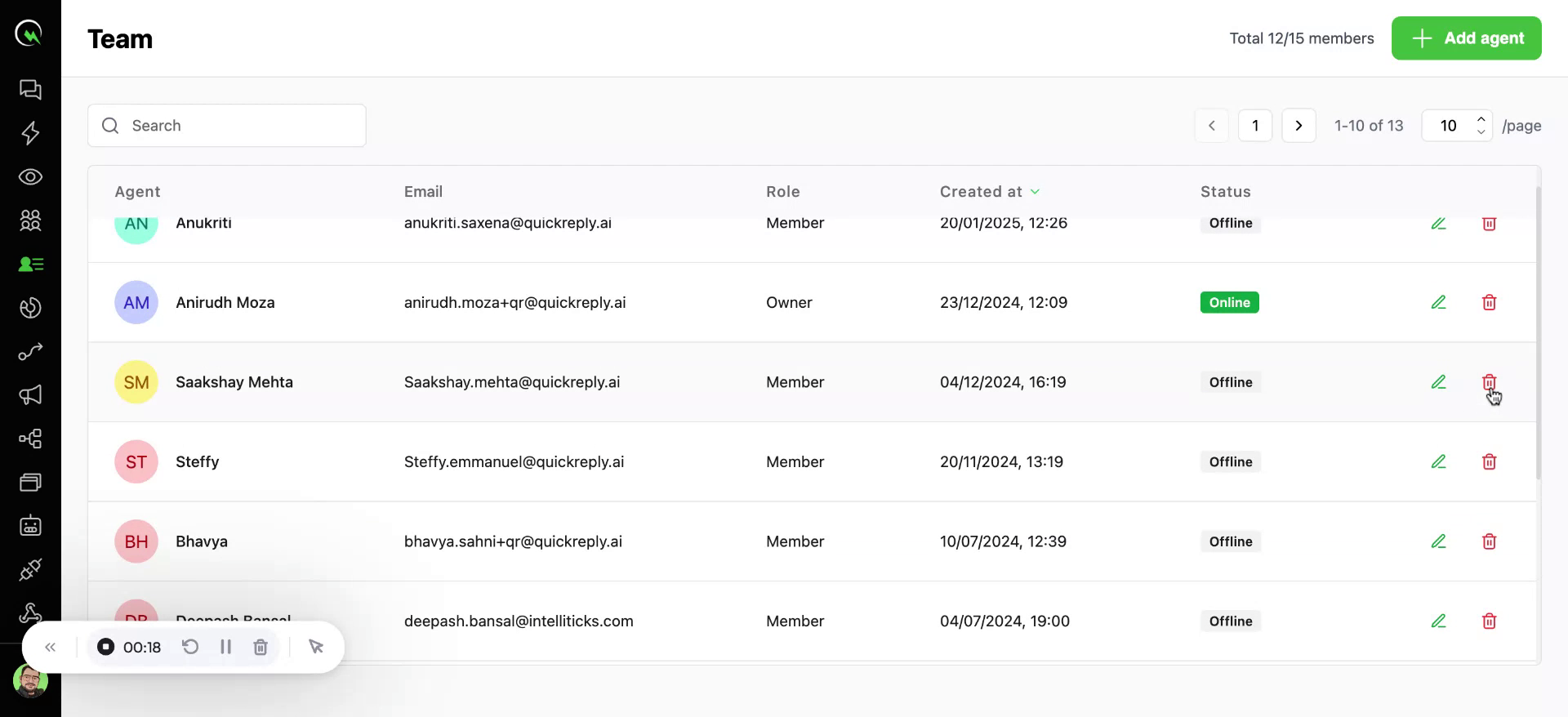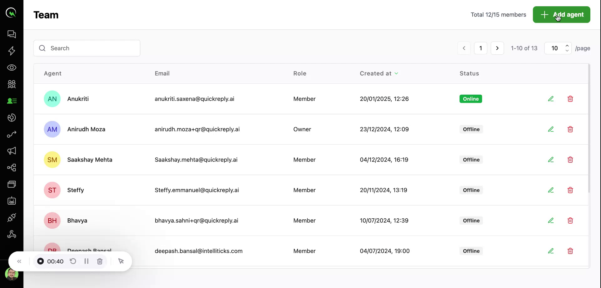 You have the ability to edit or delete team members. To add a new agent, proceed to the next step.