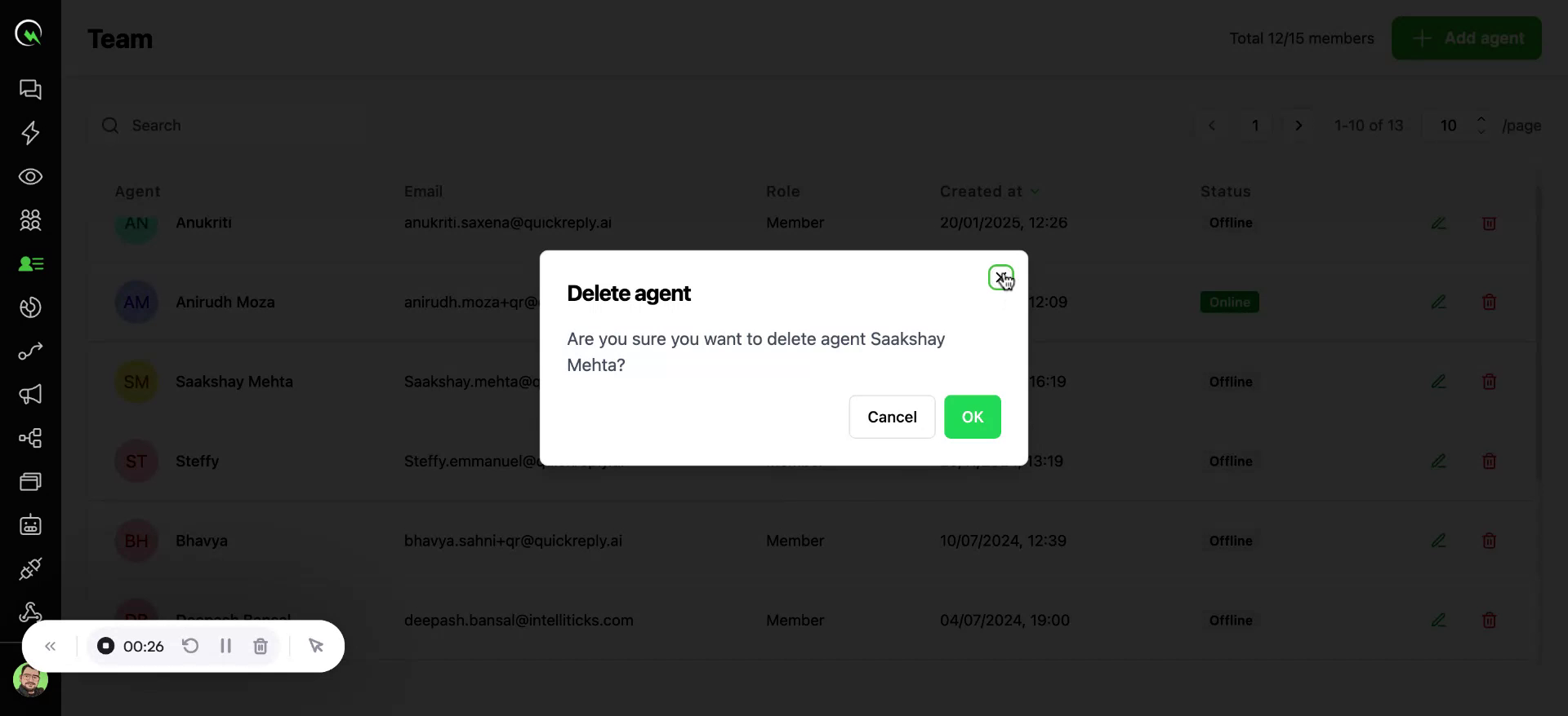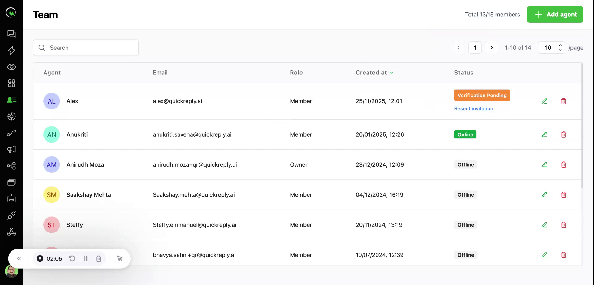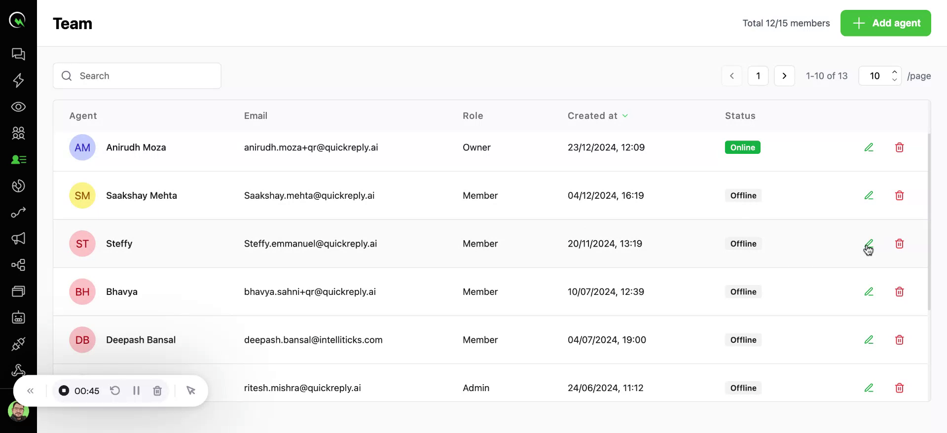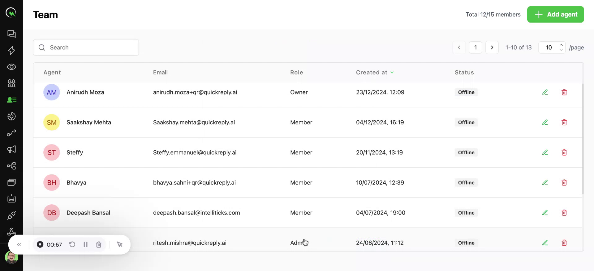 You have the ability to edit or delete team members. To add a new agent, proceed to the next step.