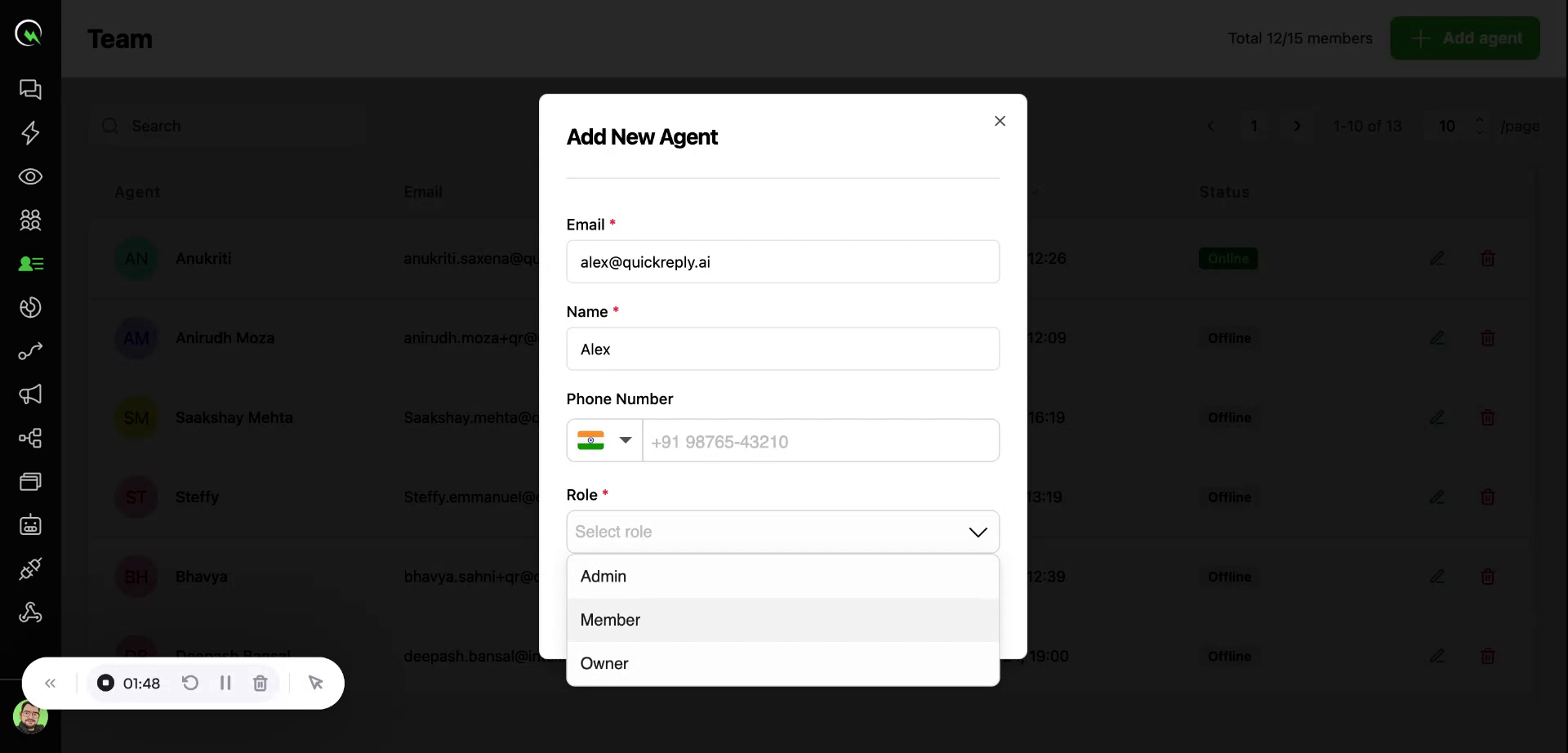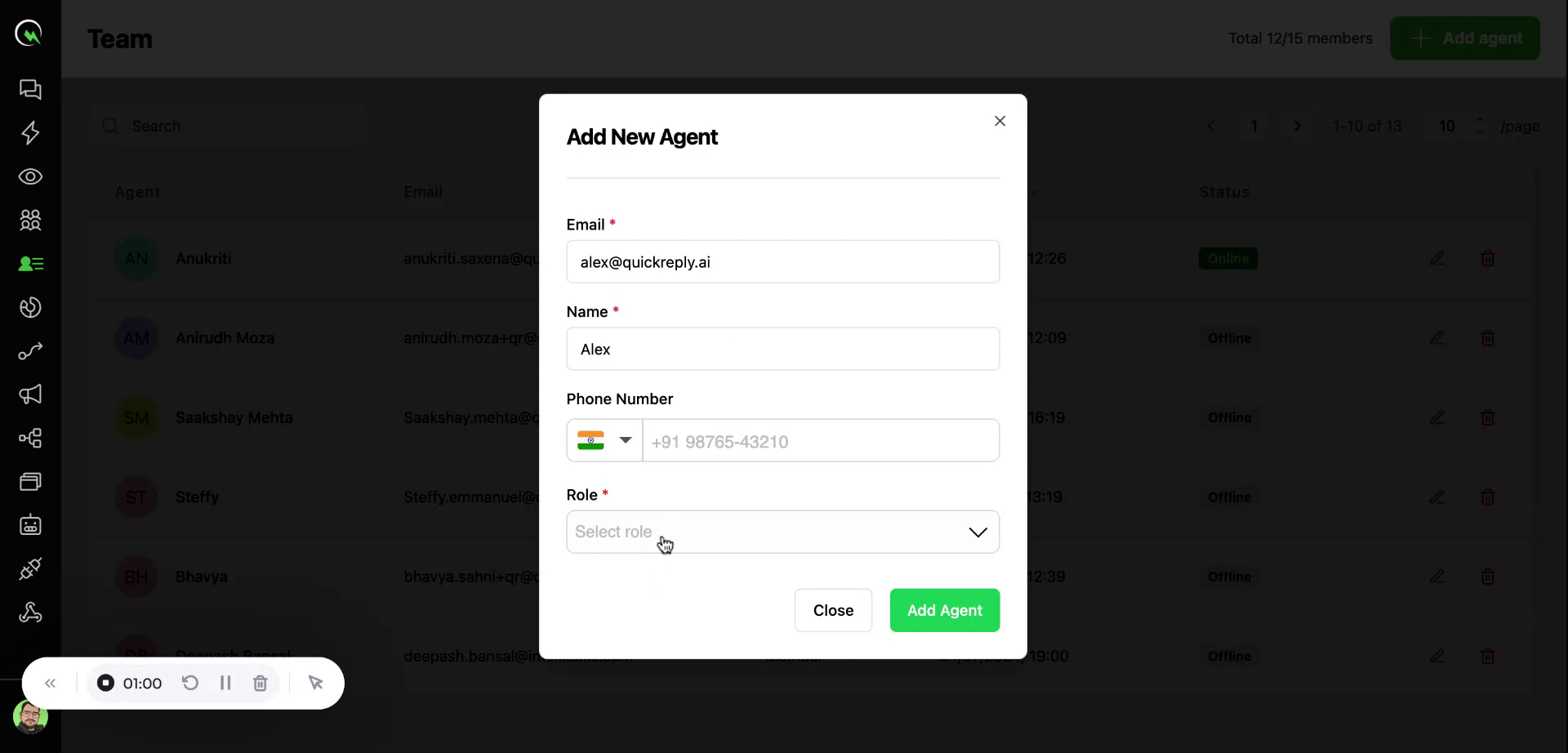 To add a new agent, such as Alex, enter the agent's email address, name, and optionally, a phone number. We highly recommend including this information. Additionally, select the appropriate role for the agent.