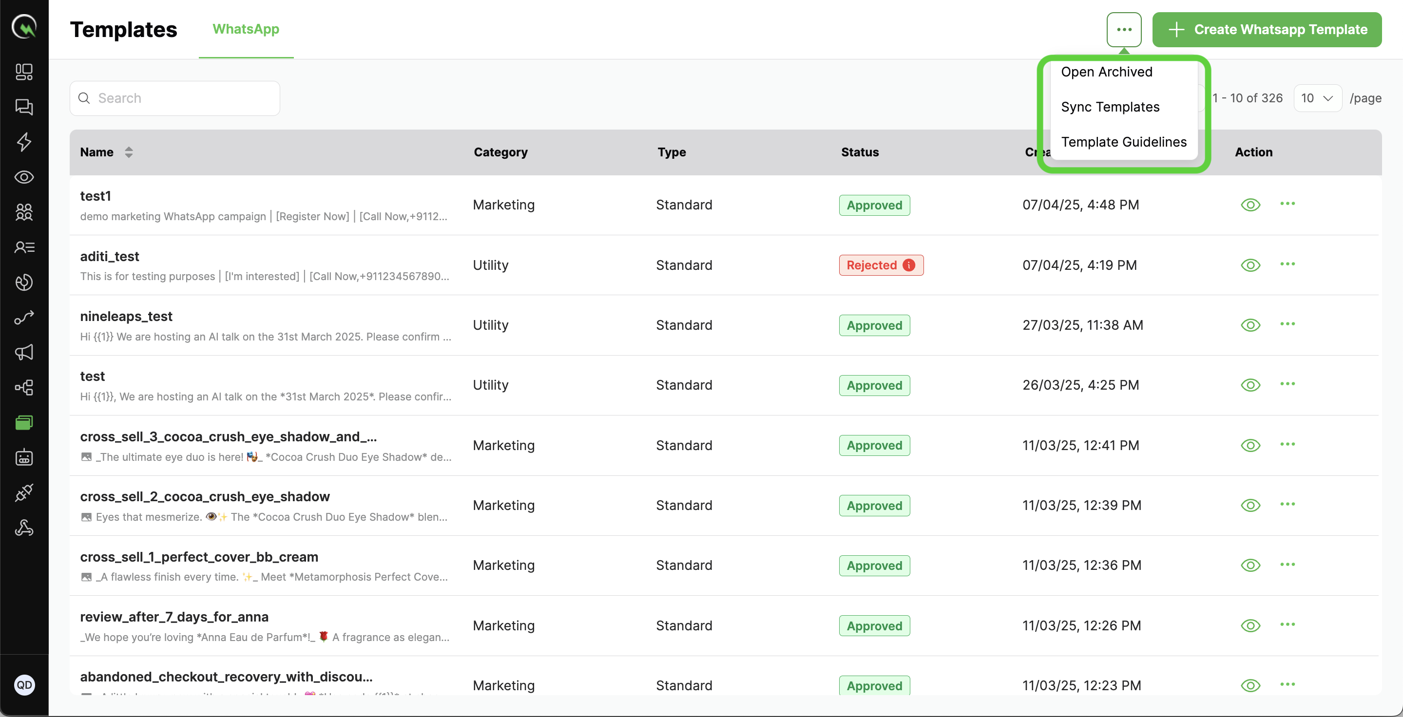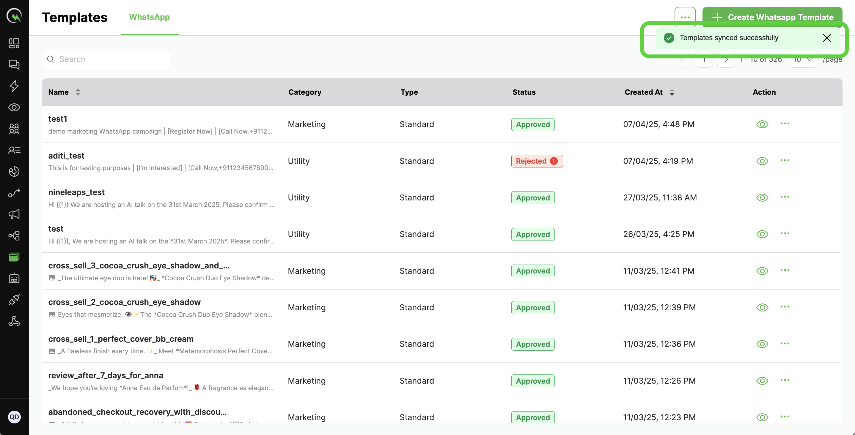 * Click the **Sync with WhatsApp** button. QuickReply will fetch the latest status of all templates from Meta’s WhatsApp API. Once completed, all updates, including newly approved or rejected templates, will be reflected in the dashboard.